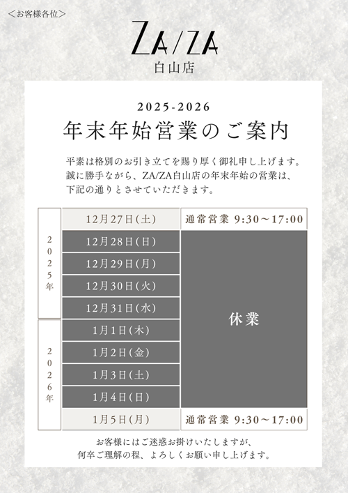 【重要】ZA/ZA白山店 年末年始営業のご案内 <2025-2026>